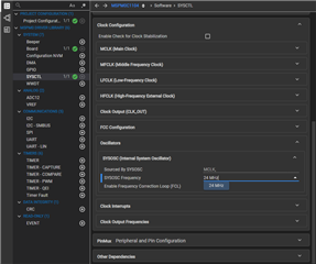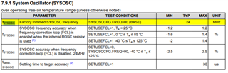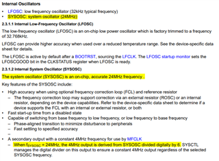 我相信能够设置 频率选择 编程到 24 是一个错误。 出现意外失真 SYSOSC 频率 如果不使用时钟树、您可以看到唯一可用的选项是 24MHz。