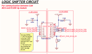 a. 双向电平转换器 (TXB0104) 由于 TI MCU 在+3.3V 的电压下运行、而 EC200 4G 模块在 1.8V 逻辑电平下运行、因此位于两个器件之间。