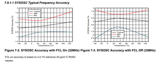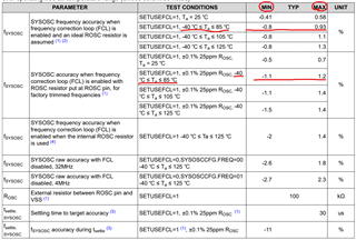我是海报的同事。 关于 MSPM0L 系列上的 SYSOSC 精度、我们使用 25°C (0.58%) 和 125°C (1.3%) 下数据表值之间的线性插值估算了中间温度下的最大误差、如下所示: