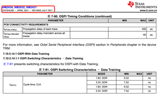 AM243x 数据表的修订版 D 中添加了 OSPI Tap 模式时序。 第一个 量产发布 (RTP) 数据表的版本为修订版 E。 在 RTP 之前数据表中的任何信息都可能会发生更改、直到 RTP 数据表发布为止、因为在器件投入生产之前 TI 仍会表征器件性能。 客户不得 根据任何 PRE-RTP 数据表设计产品。 客户应根据数据表修订版 E 或更高版本设计其产品。 注意: 任何 RTP 之前的 数据表都将 在每页侧面标有“产品预发布“或“预告信息“。 AM243x 数据表的修订版 B 标记为“预告信息“。