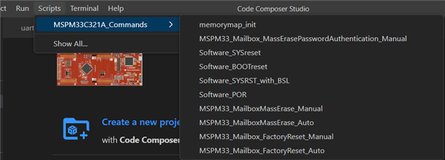 第 2 步-点击脚本 — MSPM33C321A_Commands - MSPM33_MSPM33_MCUs Mailbox_Factory Reset_Auto
