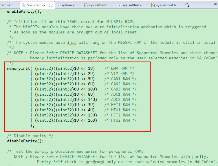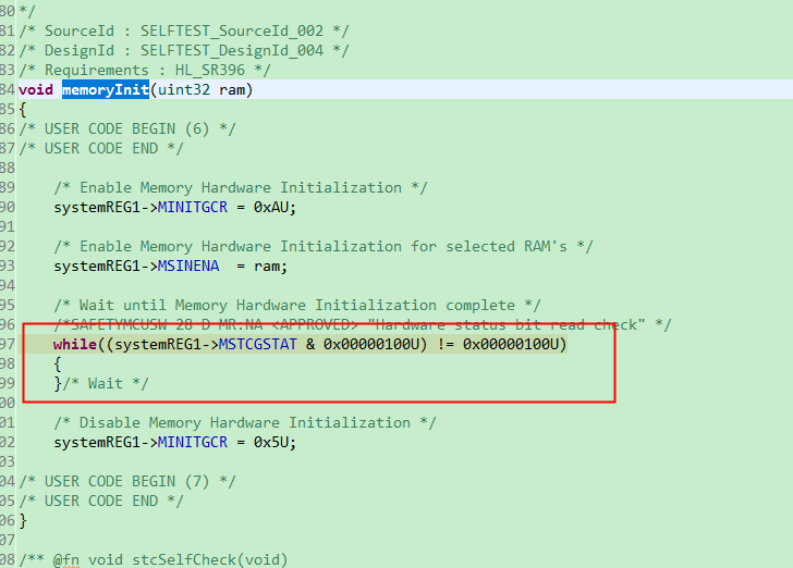 该程序可以在仿真后运行、但在通过引导加载程序刷写程序时无法运行。 通过仿真可以观察到程序一直停留在_c_int00中 memoryInit()的 while 序列中。 如图所示、寄存器信息被解释为存储器自检未完成、通过 MINISTAT、您可以看到哪些驱动器器件未能初始化其存储器、但失败的原因是什么? 通过跳过此函数运行程序是否存在任何问题?