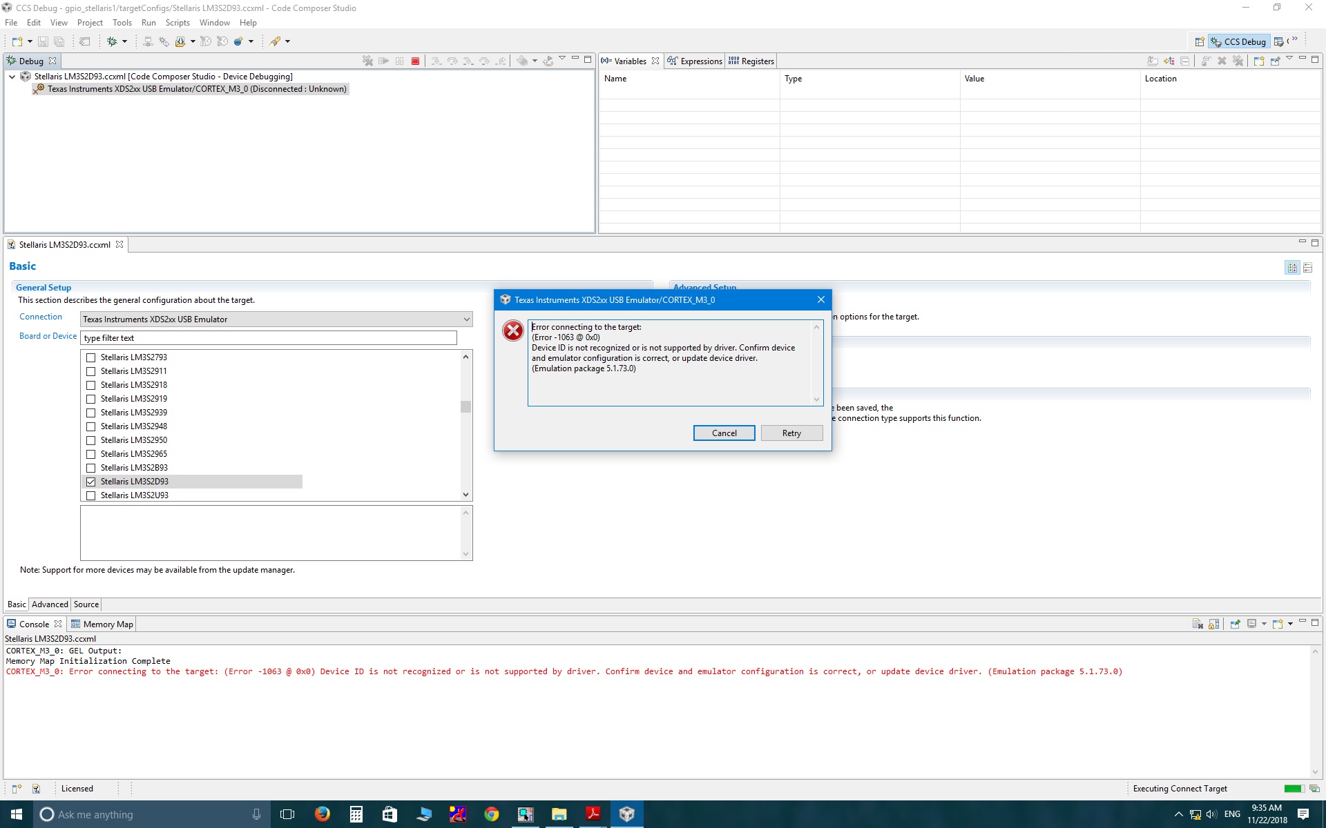 我使用 Stellaris LM3S2D93作为 BMC 在虚拟板中配置或引导 SoC TCI6638K2K。 在电路板中、电源定序完成、所有稳压器显示正确的电压。 现在、我正在测试 LM3S2D93控制器、因为我只编写了简单的 GPIO LED 发光程序、但每当我使用 xds200仿真器在 ccs5.4中连接目标时、都会引发 错误、即器件不被识别或不受支持... 由驱动程序错误1603生成