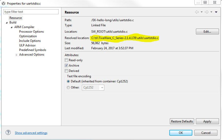 一种解决 方案是在 C:驱动器的默认位置安装最新版本的 TivaWare。 另一种解决方案是找到"uartstdio.c"和"uartstdio.h"文件、并将其复制到"ek-hello-long"项目中。
