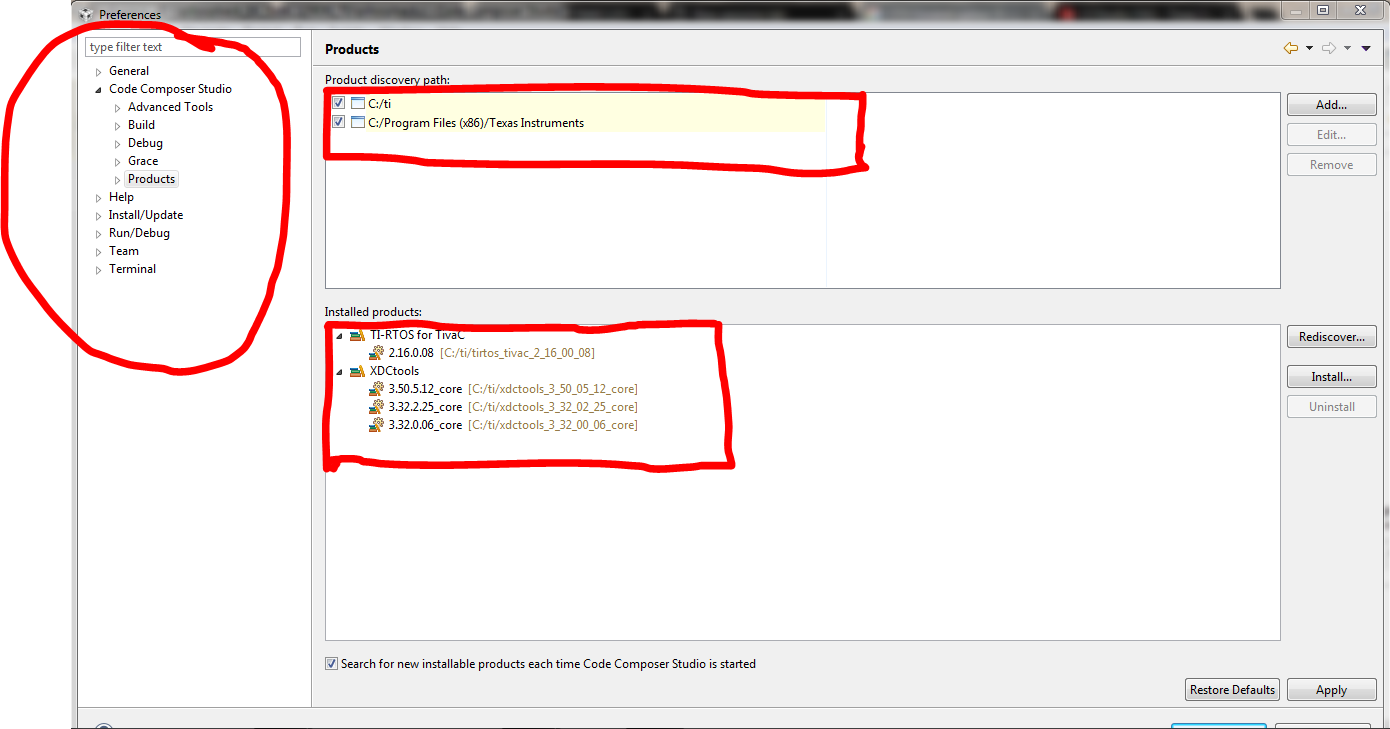 右键点击您的项目并选择"Show Build Settings...(显示构建设置...)"。 在左窗格中、您将看到 CCS General、就像我在之前的答复中显示的屏幕截图一样。 在右侧的"CCS General (CCS 常规)"下、您将看到"Main and Products (主菜单和产品)"。 单击产品、您将看到我显示的屏幕截图。