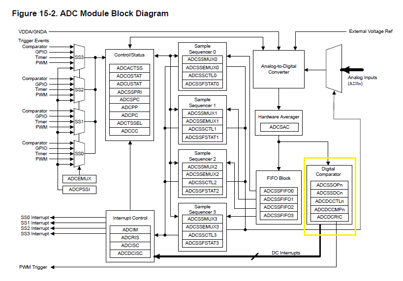 上面的 FIg15-2 (黄色框)显示 了 FIFO 和序列发生器之前的数字比较器。  黄色框表示  了添加数字比较器时需要 FIFO 的所有错误描述。 更不用说它需要一个触发源,甚至可以通过 ADCSequenceStepConfigure()进行配置。