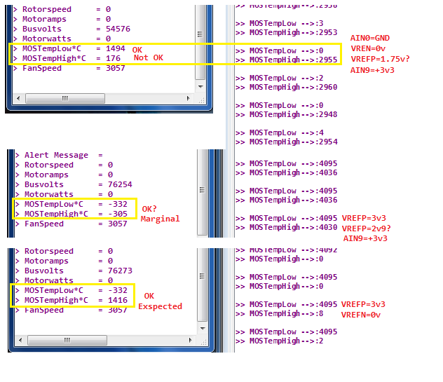 奇怪的是当步骤 1 AIN9 (MOSTempLow)被接地时,步骤0 AIN0仍然相当接近-28.5*C (+3.295v), 假定为小数点。 然而、当步骤0 AIN0接地时、两个值都变为正整数。 当 AIN0和 AIN9都接地时 ,“低”和“高    ”都是完全相同的值(158.4*C),因此公式刻度在数据表中是相当线性的。