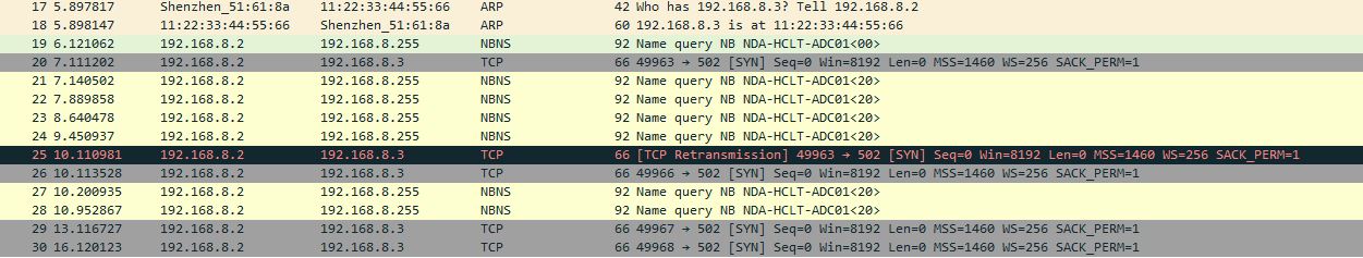 下面 显示了尝试建立以太网连接时的 Wireshark 日志。