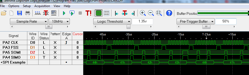 我作为从设备接收数据时没有遇到任何问题。 可能是您的问题之一、CCS 可能无法很好地显示 pui32DataRx 缓冲区、因为它是在堆栈上分配的。 表达式窗口中的显示可能会随着 SP 值的变化而变化。 将 pui32DataRx 的声明移出函数作用域会使其成为静态变量并易于在 CCS 中进行监控。 这里是捕获的值的波形和图片。