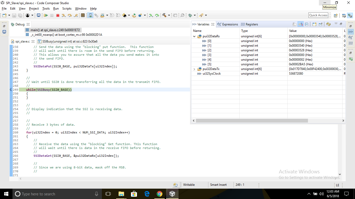 我已经在 TMS 57004 (主器件)中将波特率设置为1MHz 并启用时钟极性。我正在使用从器件(TM4C1294XL)的外部晶体振荡器25MHz。
