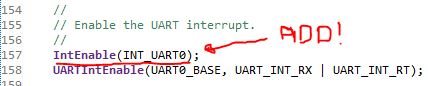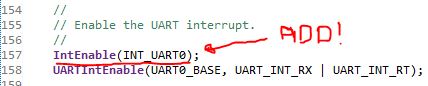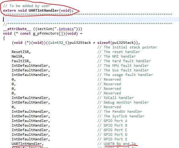 问题3: 我注意到我尚未在"tm4c1294ncppdt_startup_ccs_gcc.c"中初始化 UART0的中断处理程序您需要添加/编辑以红色突出显示的部分: