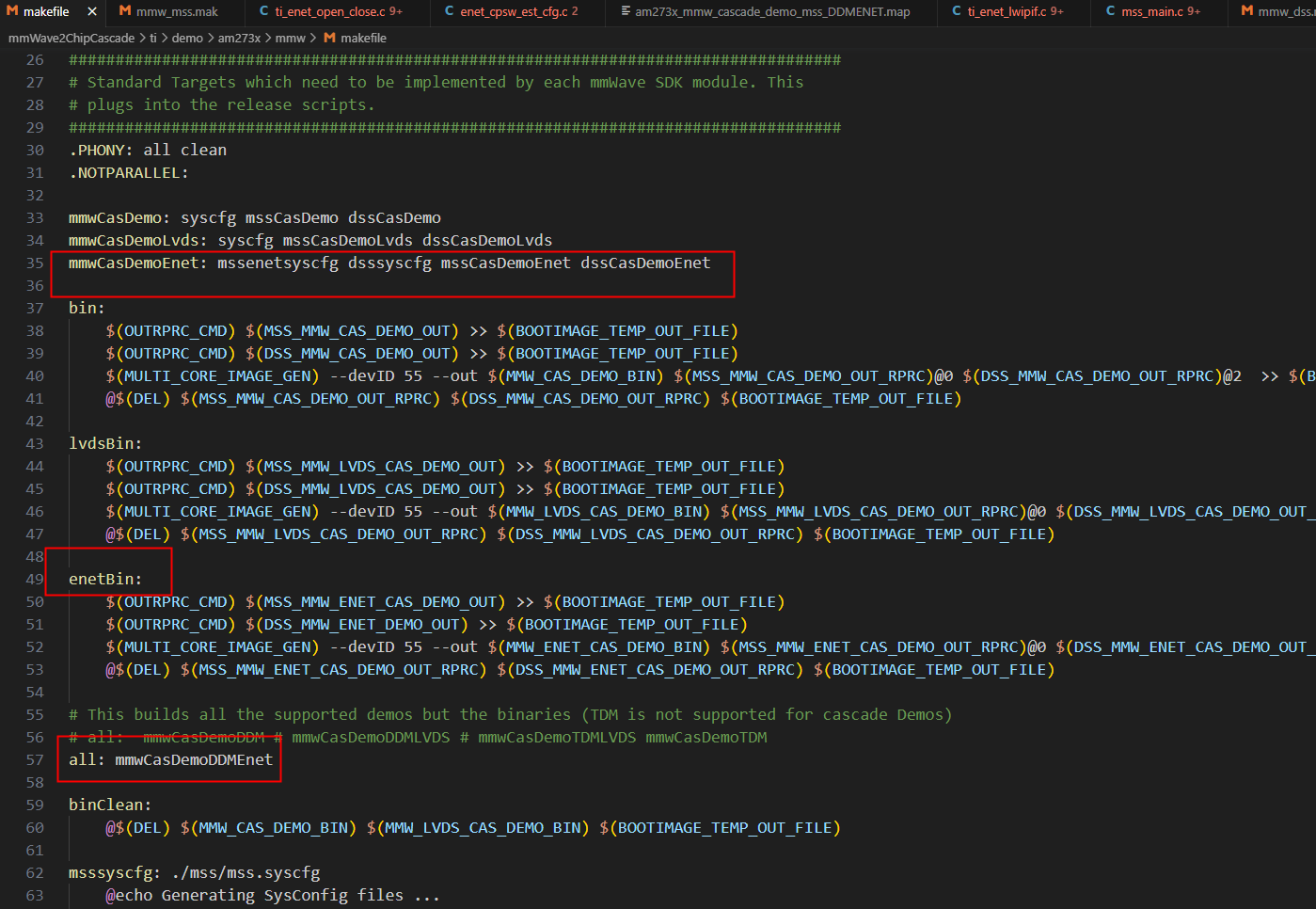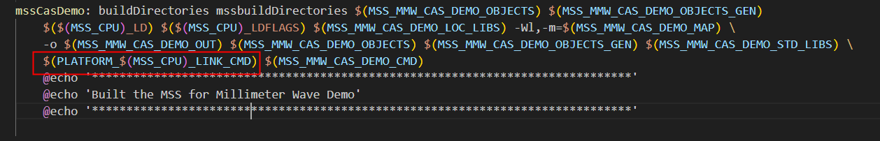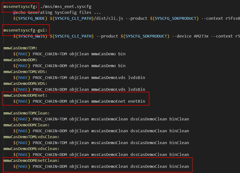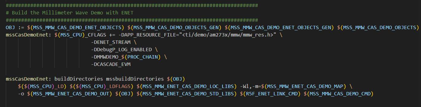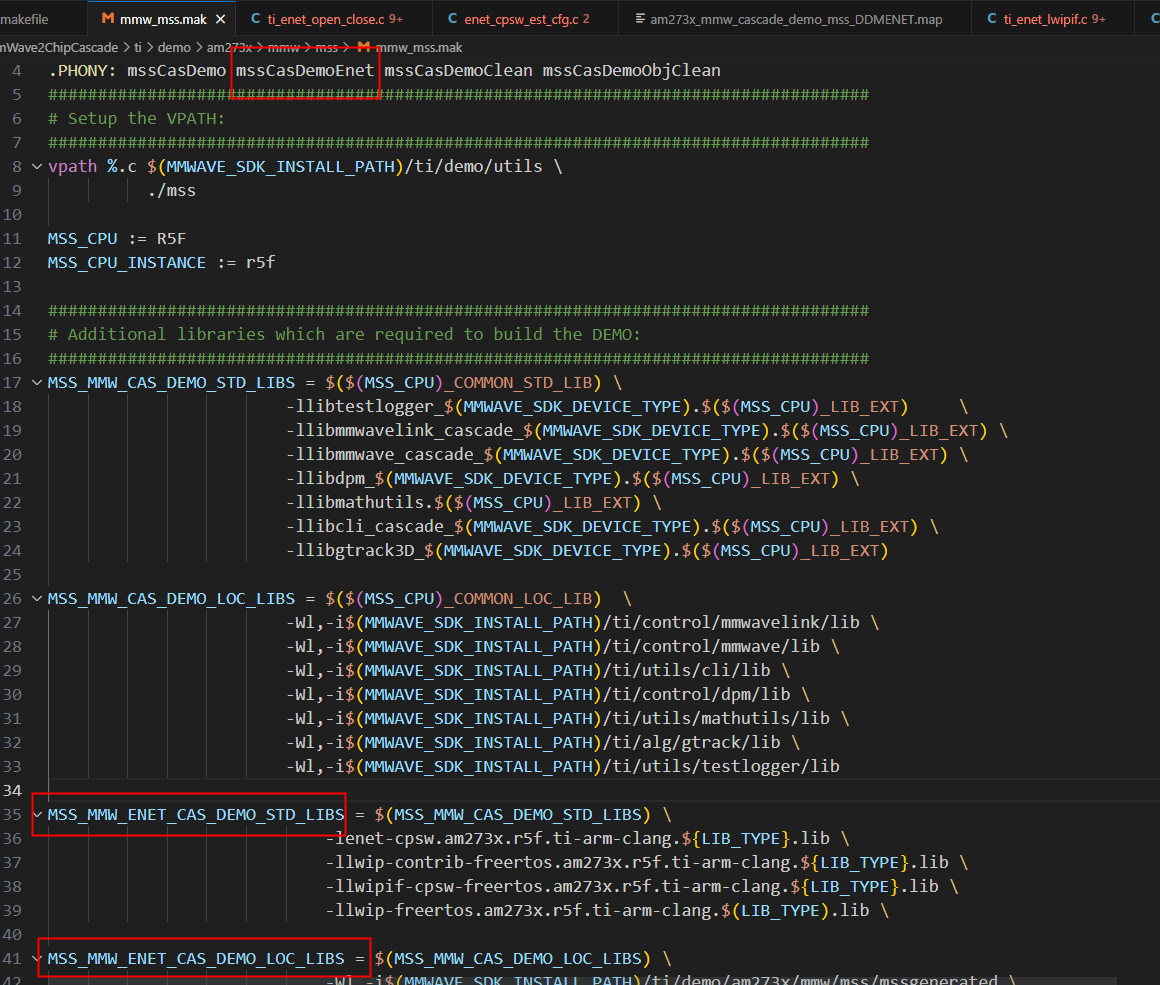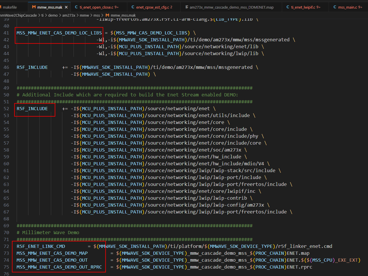 使用的 SDK 是 mmWave2ChipCascade。 主要修改了 mmWave2ChipCascade 下的 makefile 和.\mms\mmw_mss.mak 文件、如下所示: