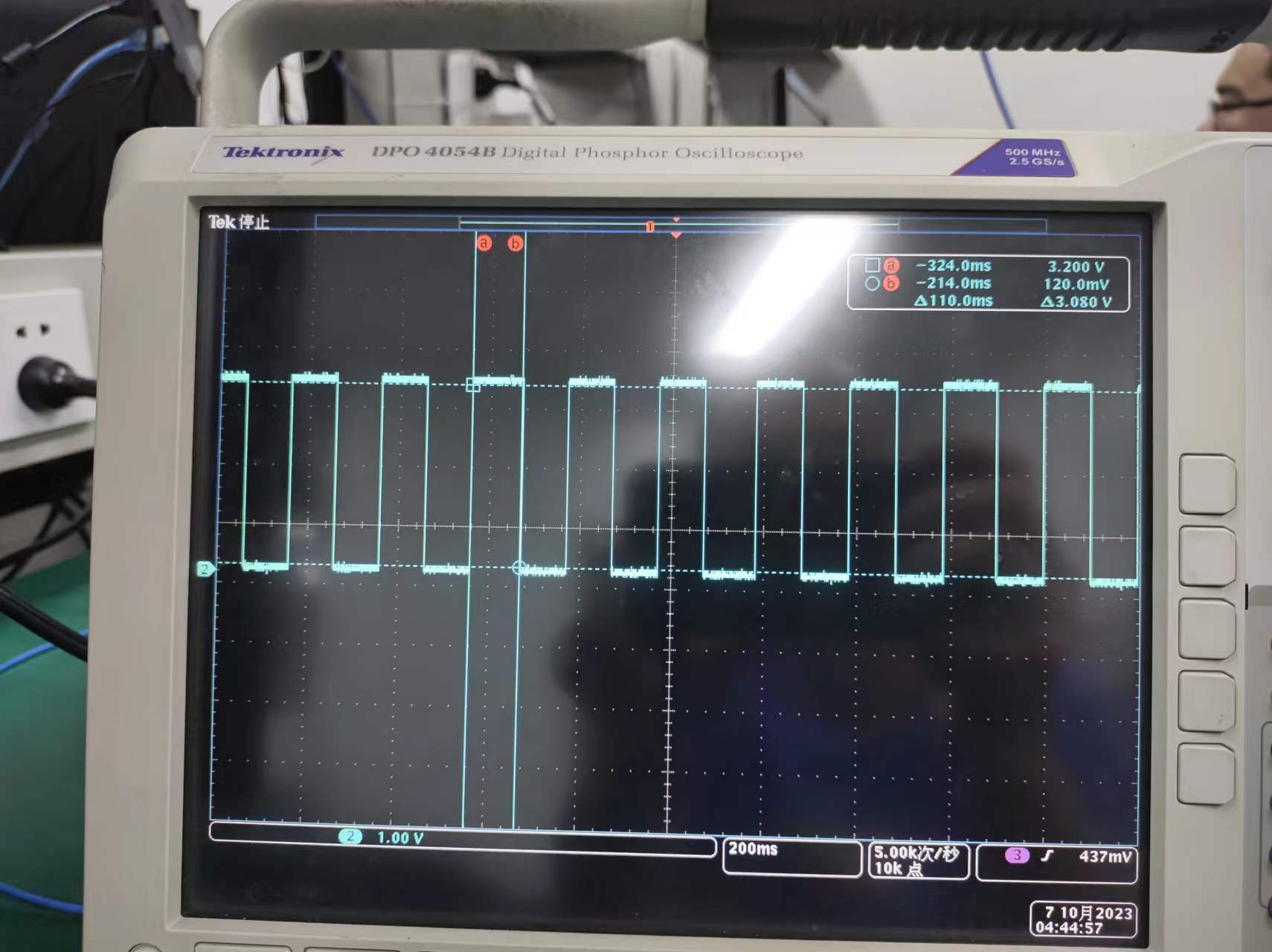 示波器的捕获如下、间隔不是很准确、 有110ms、有些为100ms:
