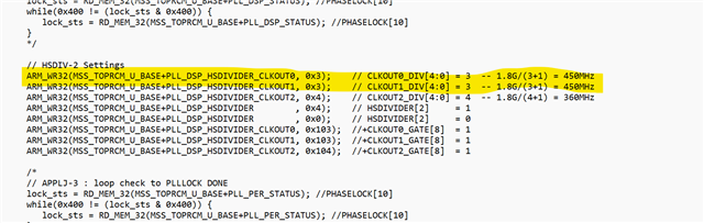 对于 AM2732 DSP、默认速度为450MHz。 我已经在 C:\ti\ccs1271\ccs\ccs_base\emulation\boards\evm_am273x\gel\evmam273x.gel 中验证了 GEL 配置文件。 DSP 时钟配置遵循 TRM 第1275页的第6.3.1章说明。 它来自内部 PLL_DSP_CLK。