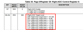 4.打开 ADC。 目标级别=-5.5,第0页注册86。 使用寄存器74将最大 AGC 增益设置为40 db