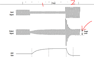 Sanjay 将继续帮助您解决这一问题,但我想立即提供一些反馈。 请记住,目标电平是 AGC 将信号保持在的平均输出电平。 如果输出正常工作,您应该会看到输出的平均值为0.37 Vrms。 但是,由于图解上没有单位,因此仍然很难判断您的输出是否正确。 输入和输出之间没有比较。 时间单位也是验证延迟和攻击时间是否准确所必需的。 我建议使用形状与上图中提供的 One Sanjay 类似的连续输入信号。 将该输入与结果输出进行比较。 这将提供更好的目标级别,延迟时间和攻击时间测试。