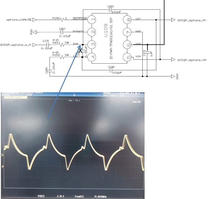 下面是客户的电路,他们看到输入引脚(IN+)上有大振荡电压。 拆下低通滤波器电容器(C181,C182)后,它们可能得到干净的正弦波。 这些电容器是否会导致此问题?
