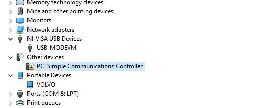 谢谢你Diego,我安装了NI-VISA和Windows 7驱动程序,我的Win10识别了带有Win7驱动程序的USB调制解调器,正如我的屏幕截图所示,但是,我不知道什么是带有yello弯头的PCI通信控制器设备...Wayne Chen