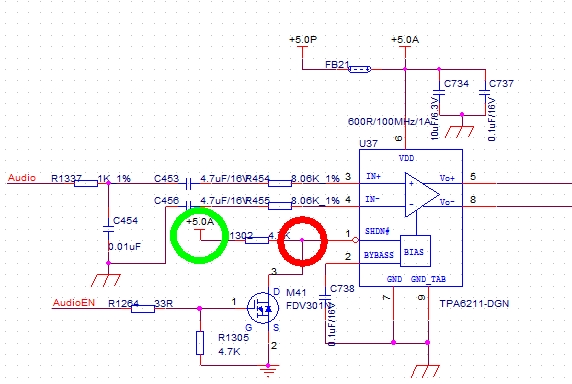 我的客户现在正在使用TPA6211A。关闭引脚损坏。 原理图如下。 我们还测试了断路引脚,电压为5.6伏。奇怪的是引脚电压高于VDD。 所以我们要检查TPA6211A的内部电路并找出损坏的原因。 谢谢。