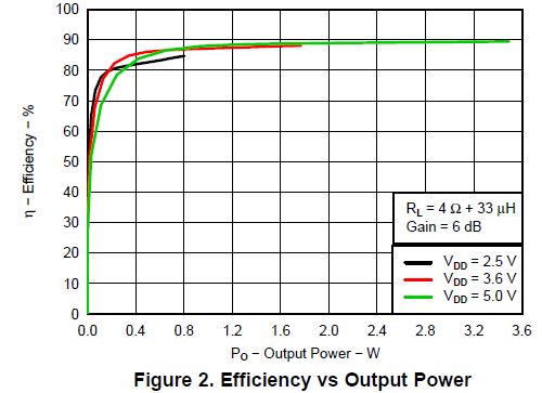 在TPA2011 d/s中,在2W/ 4Ω+33uH,Vdd=5V条件下,效率为88 %。