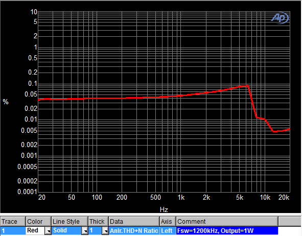 实际上,THD性能在400kHz和1200kHz之间是相同的。 请问客户为什么要使用1200MHz的切换频率? 如果PWM开关频率较高,则开关损耗也会很高,然后器件上的效率会较低。 通常,我们的大多数客户使用400kHz,在这种情况下,性能足够好。