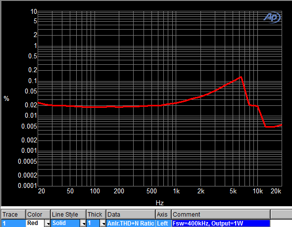 很抱歉回复太晚了,因为我正在进行bizz之旅。 请参阅以下图表,了解THD性能与频率(400kHz和1200kHz PWM开关频率)的对比情况。 测试条件是PVCC=24V,增益=26dB,RL=4Ω Ω,BTL模式。