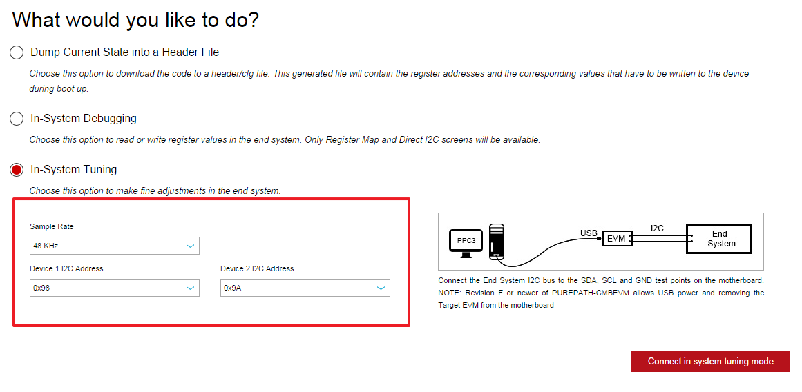 测试设置为:PPC3 ->USB->TAS5766MRMTEVM->I2C->host MCU