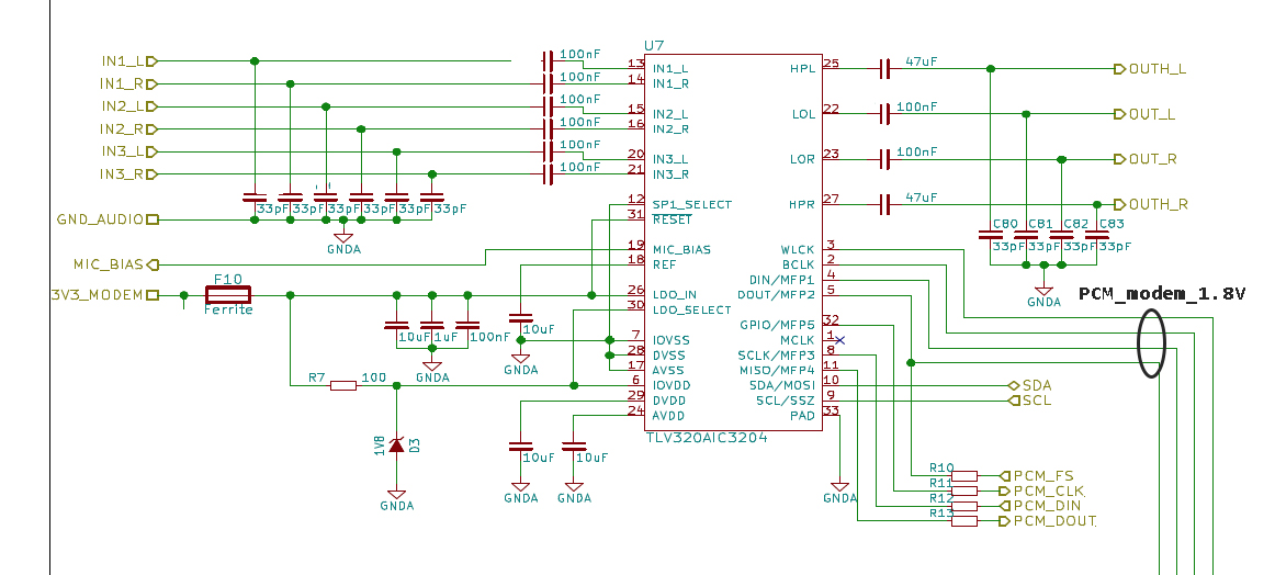 我正在查看一条连接到华为调制解调器的TLV320AIC3204电路。 此电路工作正常,但一定是出了问题,因为经过一段时间(工作数月),TLV320AIC3204会崩溃,最糟糕的是它中断了与其他外设的I2C通信。 我正在尝试检测问题是什么,但我不明白。