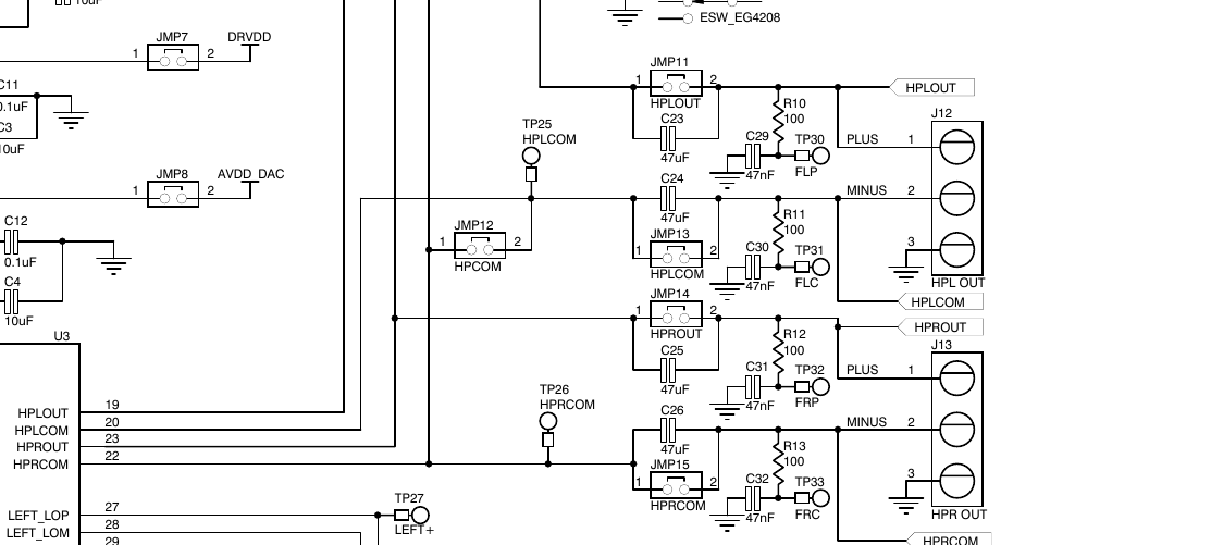 例如,如果我需要将HPROUT连接到 PAM8403放大器,我会将电路的AGND连接到PAM8403的GND,并将HPROUT连接到放大器的右侧输入。