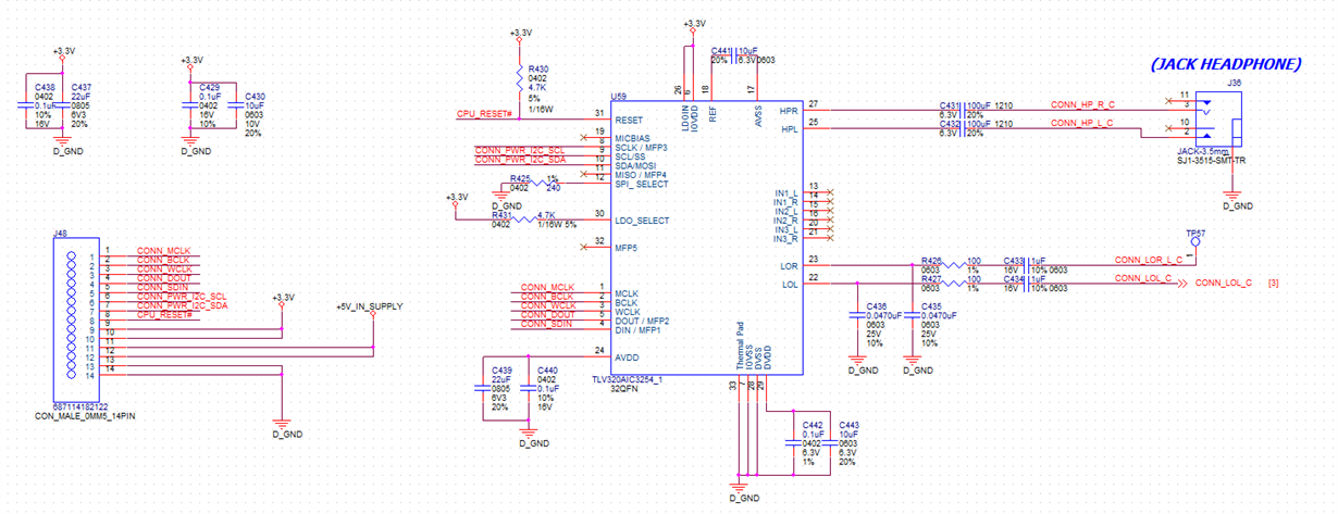 现在,我通过 I2S使用Master与TLV320AIC3254EVM-K之间的通信。 此外,我使用 I2C 接口配置I2S模式。 您可以在下面看到示意图: