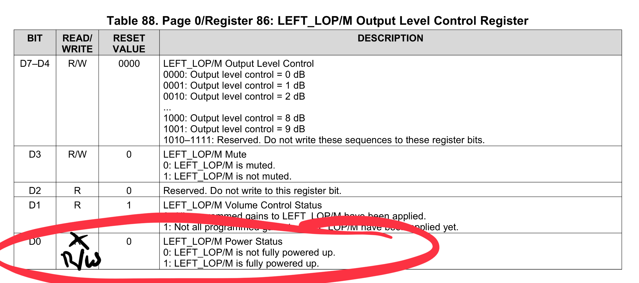 我想´ven´t左通道将输入MIC1LP/LM驱动到输出LEFT LOP/M,我想我已正确定义了寄存器,但我看不到任何寄存器来激活开关SW-L0和SW-L3。 我希望将它们关闭以将信号驱动到输出。 它们是否默认关闭?