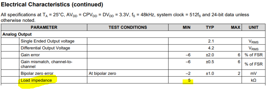 参考答案4,我确实看到了规格,但这意味着单端或差分输出电压要求负载为5kohms,IC的输出阻抗为5Kohm,因此您必须匹配输出阻抗。
