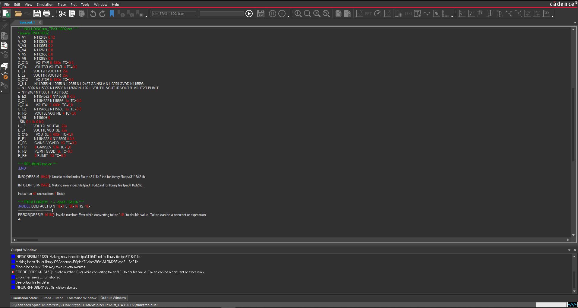 我从网站上下载了 SLOM299a、这是我要使用的文件。 我使用的是文件-打开-项目- TPA3116D2.OPJ、我在查看第1页上的原理图。   然后、我按下开始按钮、PSpice 尝试运行。 只是为了确保我删除了我在.zip 文件中提取并重新提取的 SLOM299a、以防我引起一些错误。  以下是屏幕截图。  谢谢。