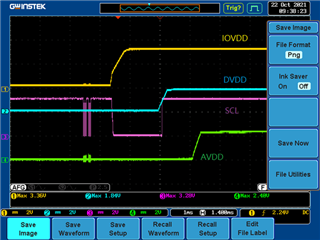 发生这种情况时、您能否提供 IOVDD、DVDD、SCL 和 RESETZ 的示波器捕获作为起点? 如果您的捕获中可以有更多通道、则添加 AVDD 和 SDA 以实现完整性。 在此调试中、我们希望确保主机不会驱动或启动任何事务。 电源序列完成后、I2C 线路应该已经为 HiZ。