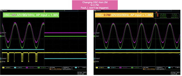 第二种方法是增加 OSC 时钟(约为2.7M)、FAULT_l 不会触发为低电平。