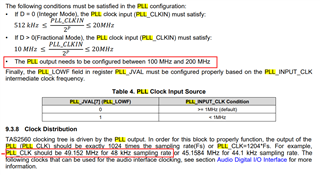 当我查看 TI TAS2560数据表时、我不了解 PLL_CLK。 该规范规定 PLL 输出需要配置在100MHz 和200MHz 之间、但例如、对于48kHz 采样率、PLL_CLK 应该是49.152MHz、这两者是否相互冲突?  以下屏幕截图