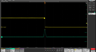 该电流在 PVcc 电源(不是示波器)上受到监控、并且在一个输出对地短路时恒定、增加1.7A。 由于两个输出都接地、因此增加了2.4A、但未达到跳闸点、因为不断消耗增加的电流。 未指示 FAULTZ。 短接的是22AWG 导线、长度约为2英寸、因此 GND 阻抗最小。 输出滤波电感器上的直接短路(0.22 Ω DCR)也无法产生足够的故障电流来触发 FAULTZ。