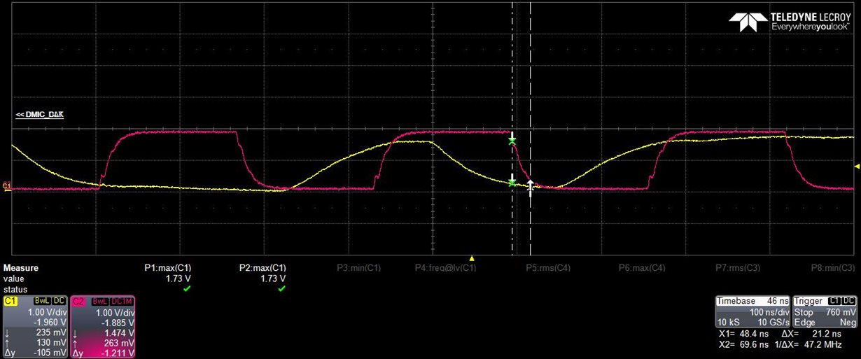 客户正在使用 TAS2563、他们对 TAS2563 PDM 时序要求有一个问题。 tr (PDM)、tf (PDM)的要求为4ns (最大值)。 但是、它们的测量值为21.2ns (下降)、25.1ns (上升)、远高于要求;它们目前的录制性能还可以;您能不能帮助检查此计时(上升、下降时间)对于 TAS2563应用是否正常?
