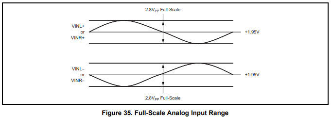 输出将是二进制补码输出、它是 I2S 和其他音频串行接口输出的标准。  满量程输入范围为+/-2.8Vp 或5.6Vpp。  因此、当 IN+处于波形的正峰值并且 IN-处于负峰值时、您将得到0x7FFFFF、当 IN-处于正峰值且 IN+处于负峰值时、输出将为0x800000。  在中标度、您将获得0x000000、而+/- 1 LSB 则为0x000001和0xFFFFFF.