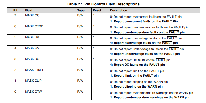 在数据表 P42中、有针对 OC/OTSD/UV/OV 等的屏蔽命令 但我找不到针对时钟错误的 mask 命令。