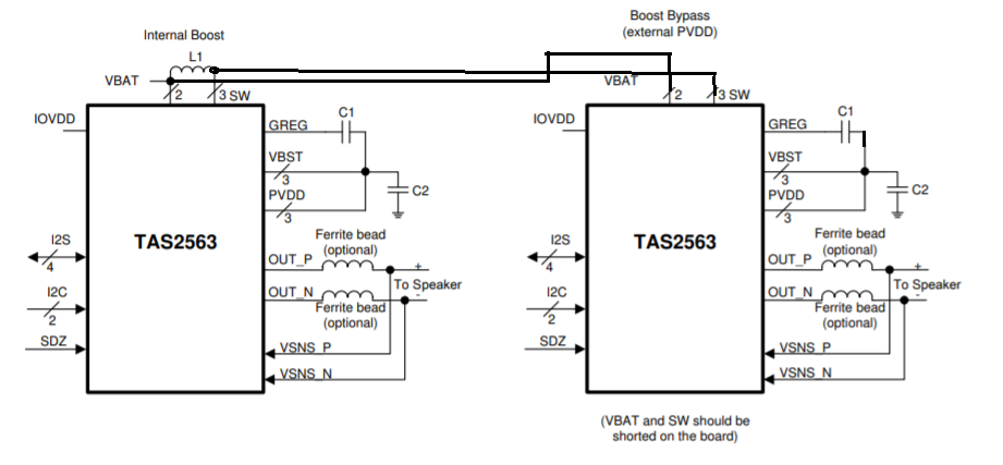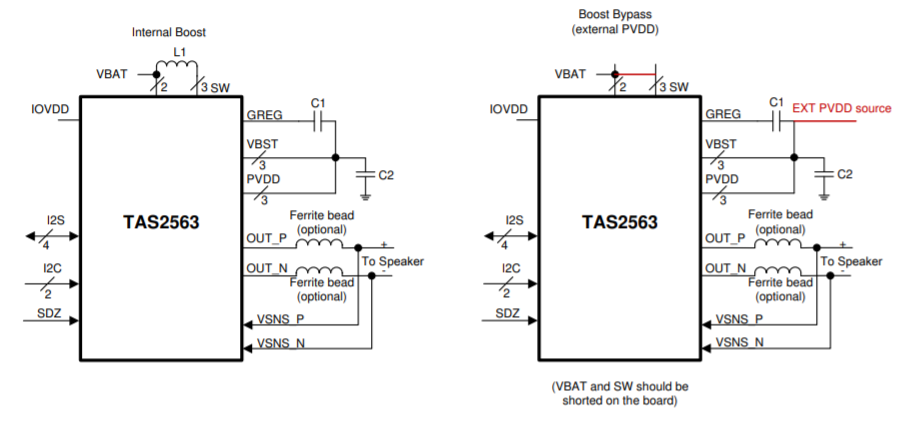 您在选项2上引用的图实际上是同一器件的两个不同选项。 我们尝试显示 TAS2563可由内部升压(左侧)或外部电压源(外部 PVDD、右侧)供电。
