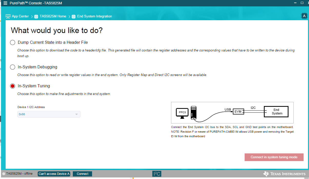 但是  、当我    通过 IIC 连接 tas5825电路板和 PurePath-CMBEVM 时  、连接不成功,提示如下图所示、