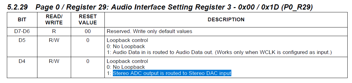 正如我在响应中突出显示的那样、设置第0页、寄存器29、位 D4为1将 ADC 数据路由到 DAC 输入。