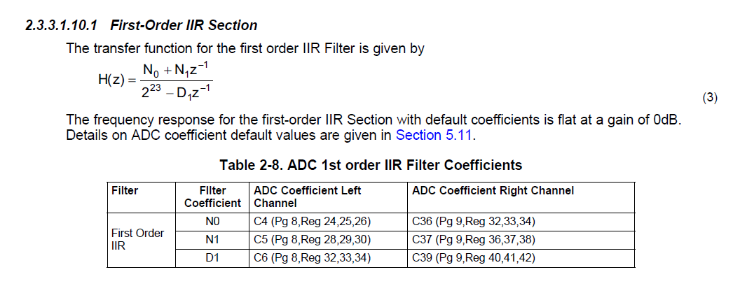 有关 IIR 一阶滤波器的详细信息、请参阅下面的小部分了解 ARG (应用参考指南)、该滤波器可配置为高通滤波器。 以下系数值专为在8kHz 工作频率下实现100Hz 截止频率而设计。