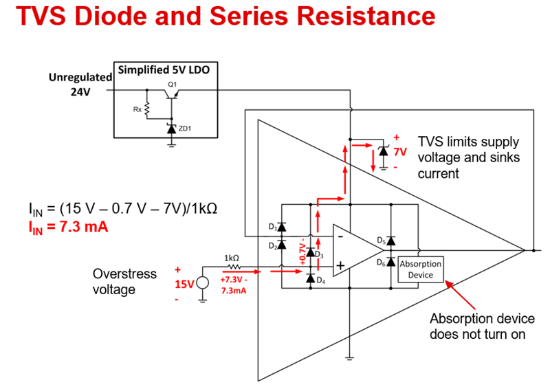 另一个有效的 EOS 保护是用于限制输入电流的串联输入电阻器。 但请记住、它会增加信号路径的噪声。