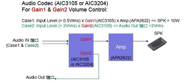 音频输入=2Vrms,音频输出=2Vrms =>将有一组 Gain2