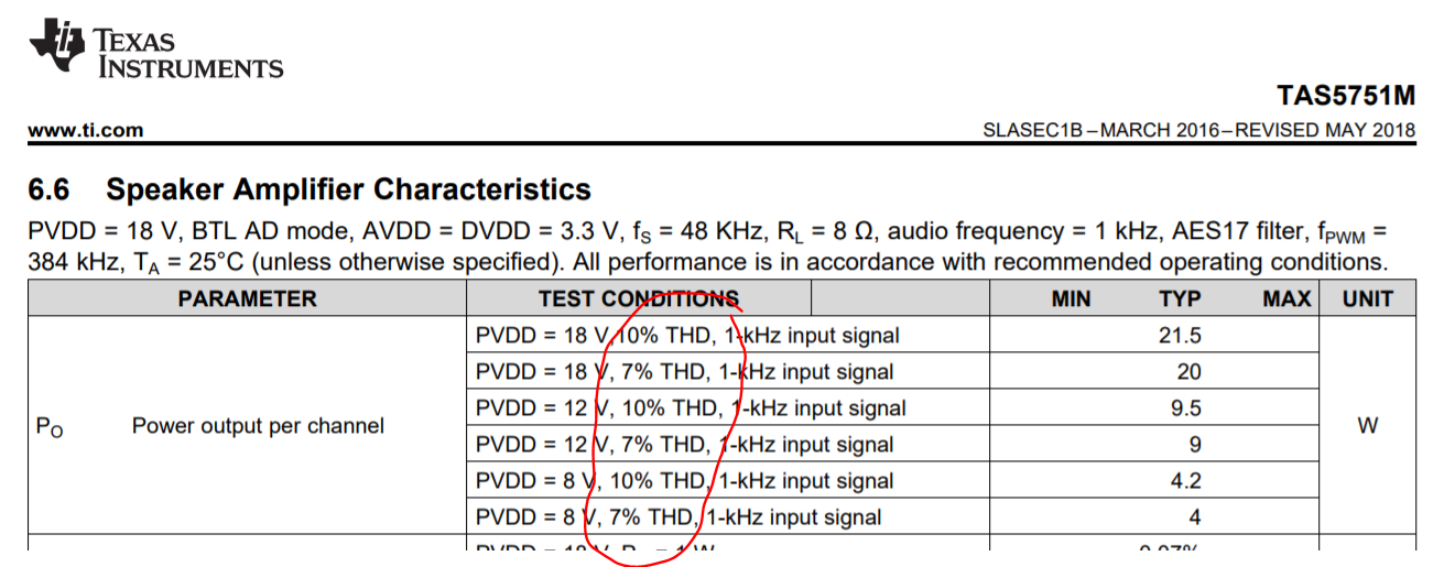 我们的客户想知道 TAS5751M 在1% THD+N 和6欧姆和8欧姆负载、18V PVDD 时的最大输出功率是多少、我们似乎仅在数据表中提供了7%和10%规格、您能帮助使用 AP 对其进行扫描以提供此类数据吗? 非常感谢!