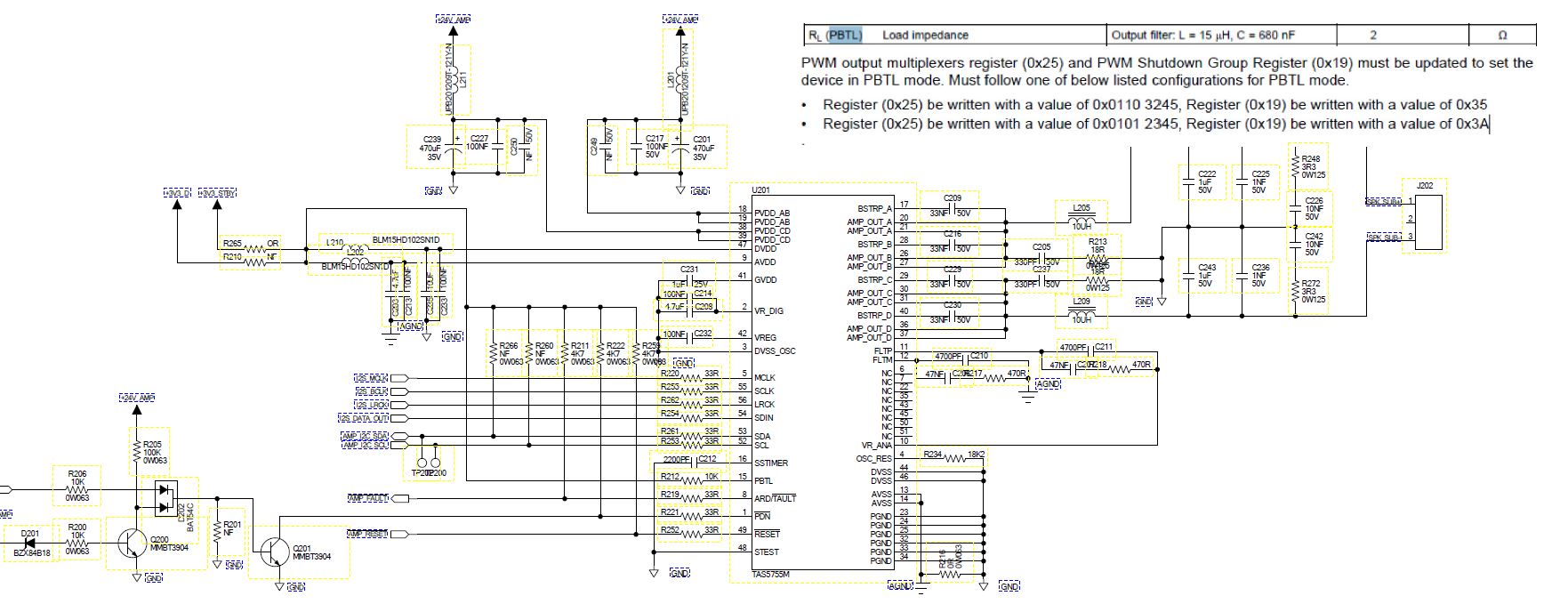 当我们使用 TAS5755M 执行 PBTL 模式24V/2ohm /50W 时,发现它将在功率达到50W 时关闭, 您能 帮助检查原理图吗? 谢谢。