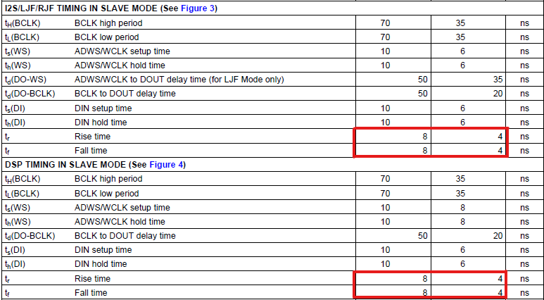 请帮助检查 AIC3104-Q1在从模式下工作时、BCLK/FS/DATA 信号的上升/下降时间要求是什么?
