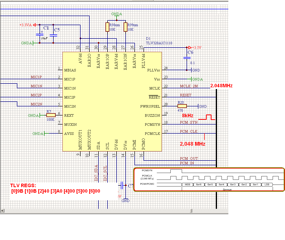 例如、我在 PCM_IN (PCM_CLK 2048000Hz、PCM_SYN 8000Hz)上生成了简单数据(数字正弦信号3000Hz)、并在 TLV 引脚 EAR2O 和 EAR1OP/N 上看到了信号输出